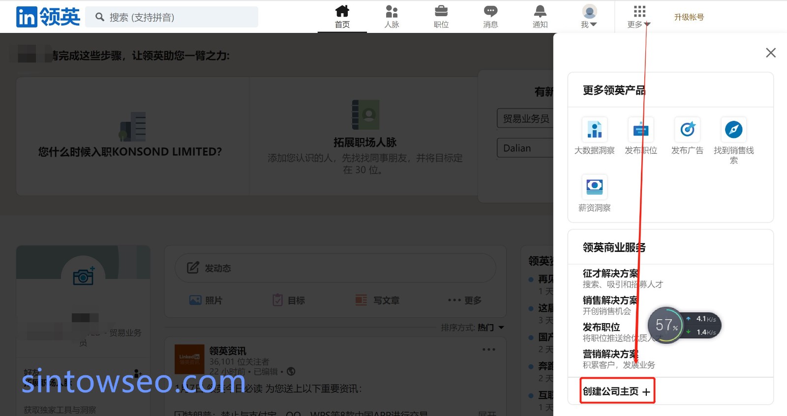 第一步:登錄領(lǐng)英官網(wǎng),點(diǎn)擊右上角“更多”下拉菜單,點(diǎn)擊“創(chuàng)建公司主頁(yè)”