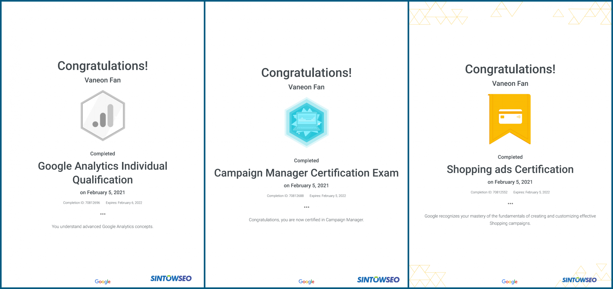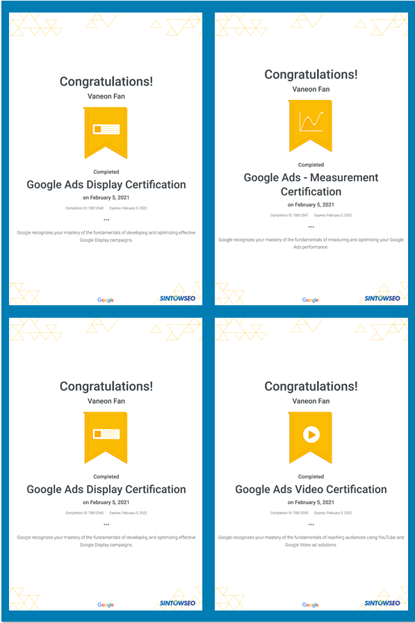 恭喜SINTOWSEO技術(shù)總監(jiān)順利通過購物廣告認證、谷歌廣告-測量認證、谷歌廣告展示認證、谷歌廣告視頻認證。