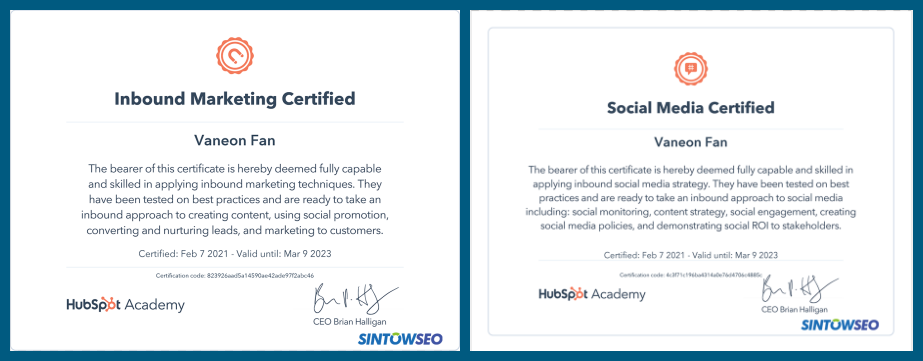 恭喜SINTOWSEO技術(shù)總監(jiān)順利通過社交媒體認證、入境營銷認證。